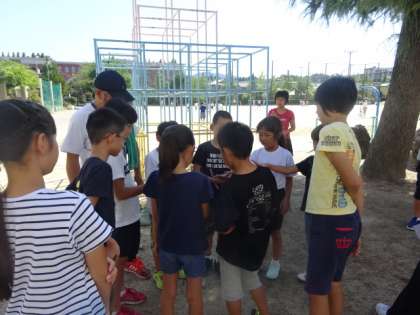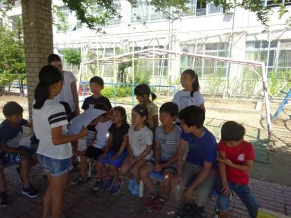 運動場では,おにごっこをしたりかくれんぼをしたり,室内遊びのグループはフルーツバスケットをしたりハンカチ落としをしたりして楽しく活動ができました。