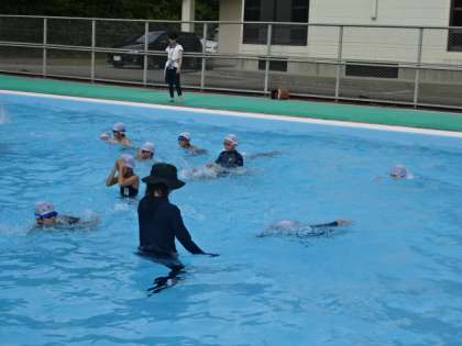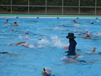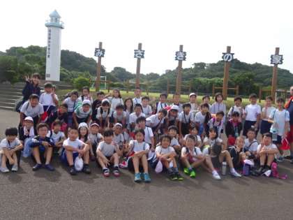 磯観察の後は記念にみんなで写真をとりました。その後,汗や砂を流すためもあり,プールに入りました。広くて学校より少し深いプールでした。とても気持ちよく泳ぐことができました。