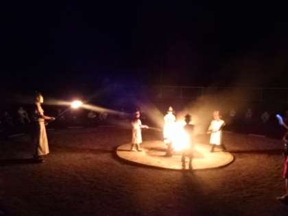 夕食の後はキャンプファイヤーを楽しみました。「もうじゅうがり」というゲームをしたり,担任の先生のお楽しみゲームがあったりして楽しく遊んだあと,フォークダンスを踊りました。事前に練習した成果が出ていました。