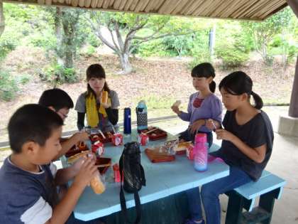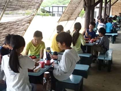 しっかり食べて,その後はみさきの家の中の散策に出かけます。夜に行うナイトハイクのコース確認も兼ねています。途中,山の砦という遊具に立ち寄る予定です。今日も良い天気です,昨日より気温は1,2度低く過ごしやすそうです。