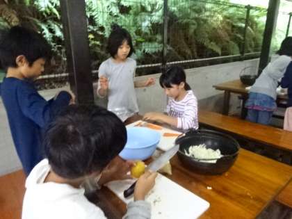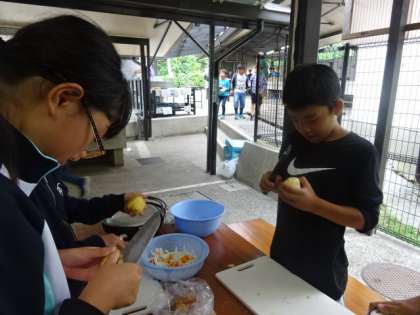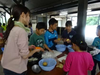 子どもたちは「おいしいカレーをつくるぞ。」と気合十分で臨みました。サマースクールで練習したことを思い出しながら,みんなで分担して進めました。玉ねぎを切る子は涙を流しながら頑張りました。