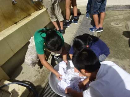 洗濯機と違い,すべて手作業です。洗濯機のありがたさを感じながらも友達と楽しく