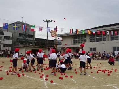 そして玉入れがスタート。かごをねらっているようですが??なかなかうまくかごに入らず,玉があちらこちらに転がっていました。けれども少しずつ玉が入り,結果は赤組の勝ちでした。
