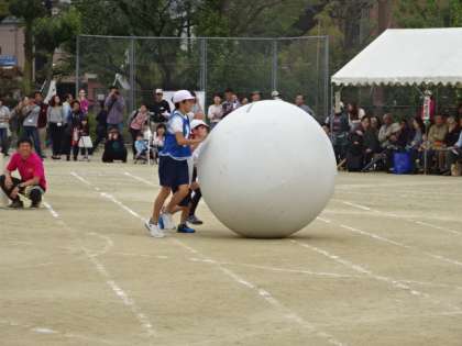 1・3・6年生の子どもたちでチームになって大玉を転がしながら運びました。6年生は1年生の速さに合わせてあげたり,交代する時に玉にぶつからないように手を引っ張ってあげたり気配りが見られました。接戦で,赤組1勝,白組1勝でした。