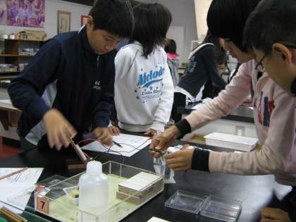 はじめは,スプーン・アルミの皿・食塩水と「あるもの」を使って電気を流してみようという課題でした。みんな様々に工夫しながら取り組んでいましたが,なかなか電気は流れません。電気を流すために必要な「あるもの」とは,実は,「人間」だったのです!食塩水で手をぬらし,太い導線の役割を人間がすることによって,電気が流れるのです。身のまわりにあるもので,簡単に電気が流れることにみんな感動しているようでした。
