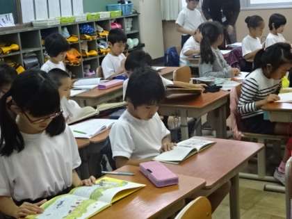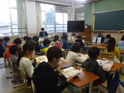 朝の帯学習の時間を朝読書タイムにあて、読書の時間を確保したり,おすすめの本を知らせる読書絵はがきに取り組んだりしています。