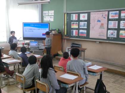 今日は,低学年の授業参観でした。3年生は総合的な学習「広げよう世界を」の授業で,自分たちで調べてきたことをパワーポイントを使って発表していました。