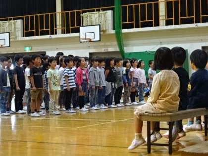 2年生は1年生と一緒に学習することが多いのでその予定を説明した後歌をプレゼントしました。大空学級は,みんなが仲良くなれる「おはよう。」というあいさつの歌を歌いました。全校で歌い盛り上がることができました。