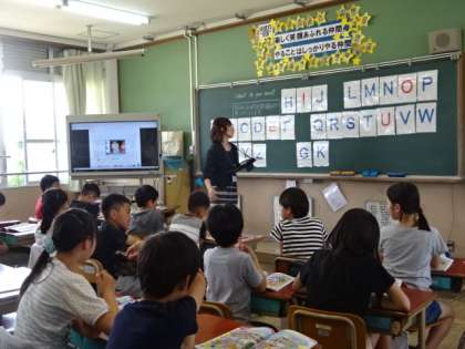 2組はアルファベットに親しむ学習でした。子どもたちは先生の示したアルファベットを指で示したり,そのアルファベットが付く言葉を発音したりしました。