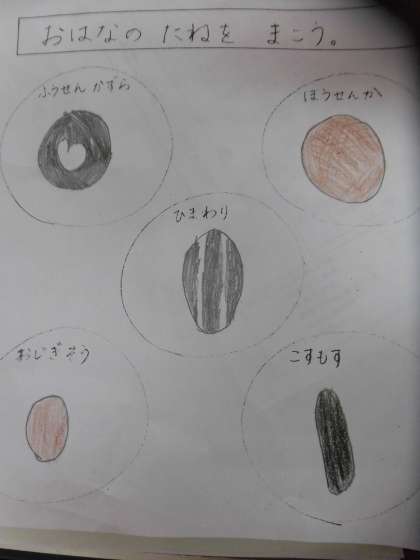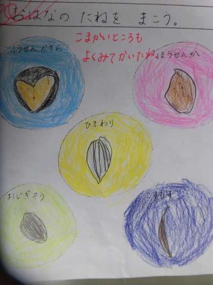 生活科の時間に,お花の種を観察しました。ホウセンカ・ヒマワリ・オジギソウ・フウセンカズラ・コスモスの種を細かいところまでよく観察して描きました。
