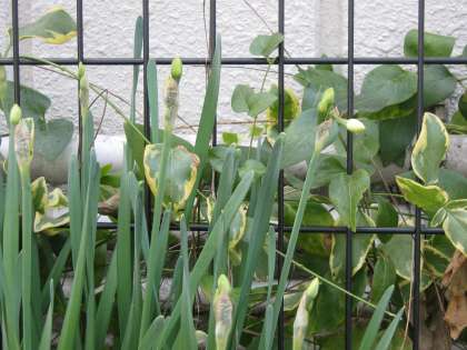 その中で,ひときわ高く育っているスイセンを発見。近寄ってみると,先に薄黄みがかったつぼみがついています。もうすぐ咲くかも〜。一足早く出てきてしまって寒いだろうけれど,見ているわたしの心は,春へ一歩近づいたような温かい気持ちになりました。