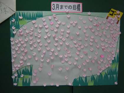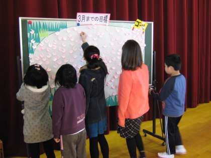 ウサギに目標を書いた子どもたちが,壇上に上がって貼りに来ました。思い思いの場所に貼りました。中には道をはみ出しているウサギや,反対を向いて迷っているウサギ,もうゴールしてしまっているウサギもいます。掲示板のかわいいウサギのように,いろいろな個性をもった子どもたちが,一人一人自分の目標に向かってがんばれるように,全力で応援していきたいと思います。