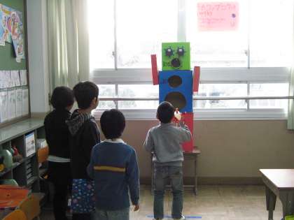 「紙コップロケット」では,的になる大きな人形が作ってありました。高得点の穴に入れようと,みんな一生懸命挑戦していました。「ボーリング」では,見事にストライクを出す子どももいて,盛り上がっていました。