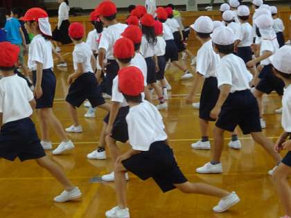 運動会で行う全校ダンスの振りを覚えるため体育館で練習を行いました。全校ダンス係の5・6年の子ども達が手本を見せてくれました。