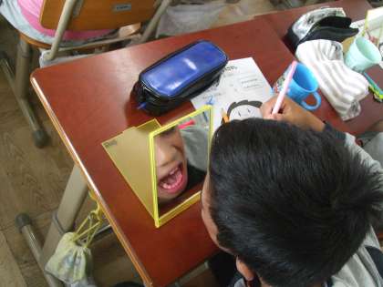 歯垢染出しと歯みがき指導を行いました。写真は5年生の様子です。これまでの学習を思い出しながら,「食生活」「歯みがきの仕方」「唾液の量」「歯の質」などが影響してむし歯になることを確認しました。