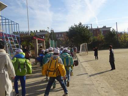 5年生の子どもたちは,今日より花背山の家野外活動に3泊4日で出かけます。朝,子どもたちは大きな荷物を持って元気に登校してきました。