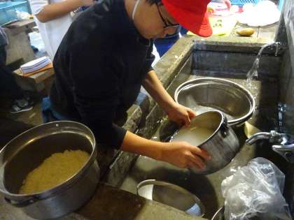 火がよういできたところでいよいよ野外炊事です。カレーを作ります。みんな手際よく野菜を切ったり米を研いだりしていました。家庭科の時にも言っていますが,みんな自分の仕事が終わった時にはやれることがないかと考え,使い終わった用具を洗ったりお皿を並べたり積極的に動いていました。