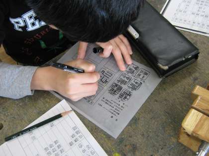 印を彫るのには,白文と朱文があって,子どもたちは字の部分を彫る白文の方で作ります。自分の名前の漢字を昔の文字の中から選んで,トレーシングペーパーに写しました。