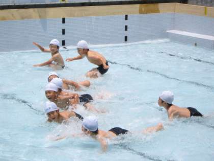 気温は上がっているのですが水温はそれほどでもないので,少しぶるっとする子もいましたが,まぶしい太陽に当たりながら元気に学習しました。