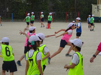 5年生は体育科の時間に「リレー」を学習していました。バトンの受け渡し方法を学び,チームの友達と一緒に楽しく練習していました。