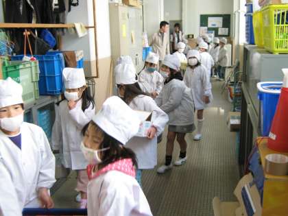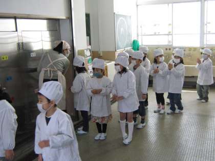2列に並んで,給食室の前で元気にあいさつしました。手洗いの後,アルコール消毒をして,おかずやパンを取りに行きました。