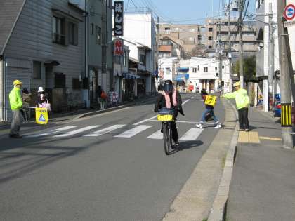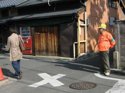 場所は,室町寺之内の横断歩道と上御霊前通りと衣棚通りの交差点辺りです。横断歩道の渡り方や道路の右側を歩くことなどを中心に声をかけいただきました。小学生はもちろんのこと,中学生や通勤途中の皆さんにも声をかけながら,安全を見守ってくださいました。