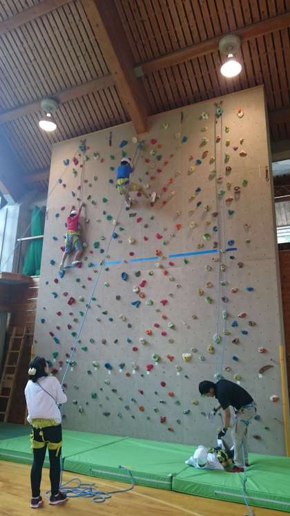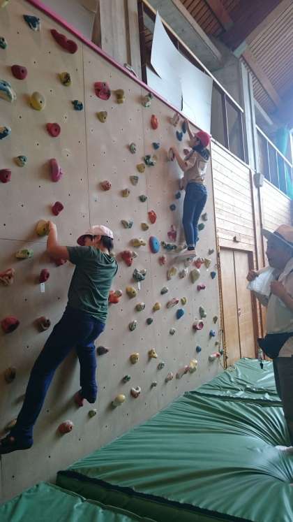 昼食の後のお楽しみ。ボルダリングの様子です。一歩一歩足場を確かめながら,上に登っていきました。低い壁から挑戦し,最終的には高い壁に挑戦した子どももいました。貴重な経験ができました。
