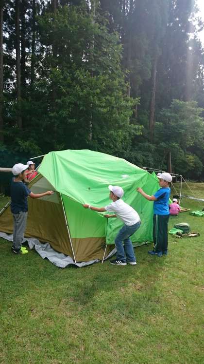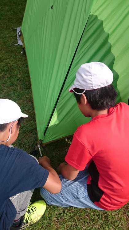 今晩,寝ることになるテントを設営しました。所員さんの説明をよく聞き,グループの友達と協力してテントを作りました。「みんな上手にできていた。」と引率の先生が言っていました。このまま天気が悪くならなければ,テントで眠ります。