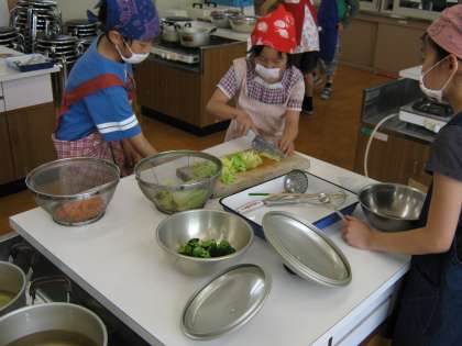 次に,ゆでました。野菜によって切り方も違いますが,ゆでる時間も違います。グループで協力して調理しました。
