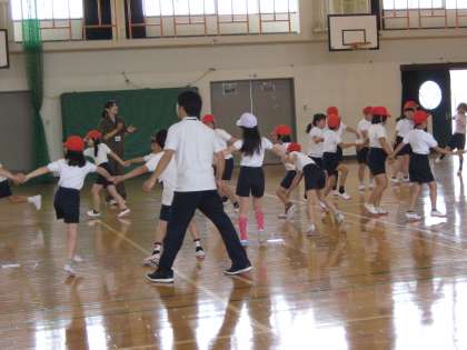 ちょうど「レッツ!キッス!ほほ寄せて!」のジェンカを踊っているところでした。前の人の肩に手をかけて,列を組んで,リズムよくジャンプしています。先頭の子どもは,あちらへ行ったりこちらへ来たり・・みんな楽しそうです。