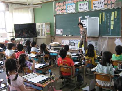 3年生になってから,書道の学習が始まりました。3・4年の書写は,教育支援の村瀬教諭と担任との協力指導の形をとっています。