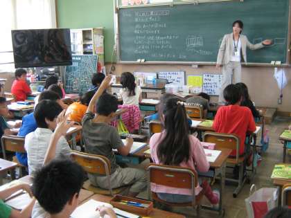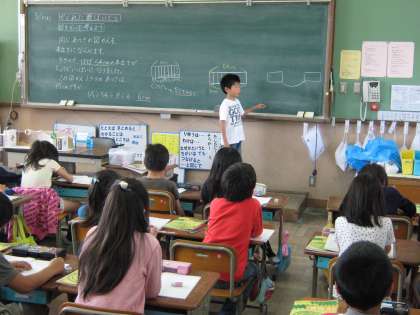 本校の教育が目指している「考え表現する子」を育てる授業展開です。3年生の算数科は,担任と協力指導の木下教諭の二人で指導にあたっています。この時間のように,どちらかが支援にまわるときもあれば,少人数グループに分かれるときもあります。