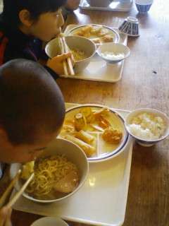 昼食は,いくつかの献立から事前に選んだものと,バイキングで自由にとれるものを組み合わせて食べます。子どもたちの人気は,ラーメンライス。量もたっぷりあって,おいしそうですね。ほかには,カレーライスやうどん定食のようなものもあります。