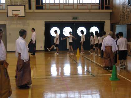 続いて,保存会の皆さんの模範演技を見せていただきました。伝統作法にのっとり,鞠をけり上げる様子に,子どもたちから拍手が起こりました。