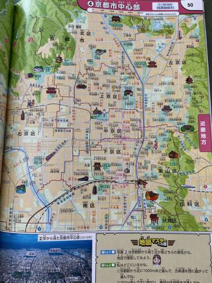 3年生のみなさんがもっている社会科の地図帳の中には,京都市のページもあります。室町小学校は,どのあたりにあるのでしょうか。「このあたり」と鉛筆でしるしを付けてもよいかもしれませんね。ぜひ,地図帳をひろげてみてください。