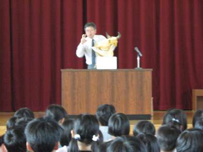 今日は、私が集めた動物の頭の骨をいろいろ持ってきました。しばらく校長室前に飾っておきますのでどんな動物の歯や骨か考えてみてください。わたしが飼っていた小さな動物の骨もあるので大切に扱ってください。