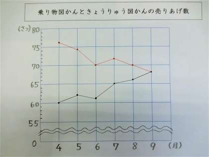赤線が乗り物図かんで,黒線がきょうりゅう図かんの冊数を表しています。