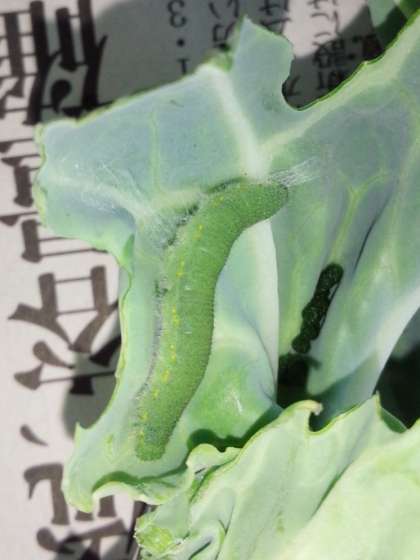 元気に動いてキャベツもたっぷり食べていました。右に見える黒いつぶつぶは,幼虫(ようちゅう)のフンですよ!