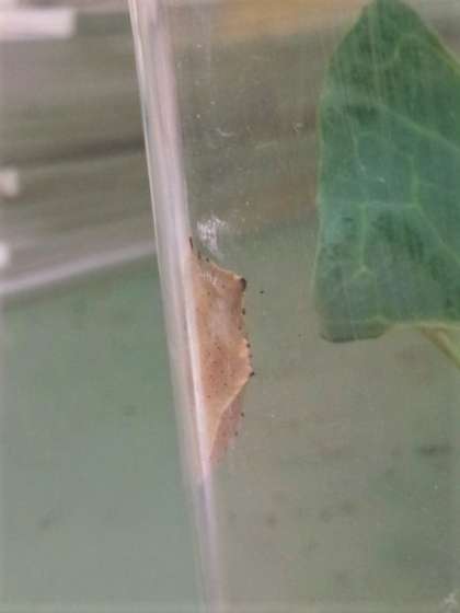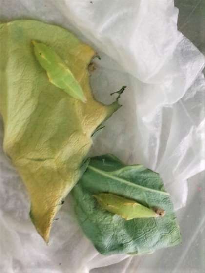 今日,教室の虫かごの中にいる幼虫(ようちゅう)たちが食べるキャベツの葉を入れかえようとのぞいてみると・・・さなぎ!さなぎ!さなぎ!