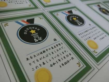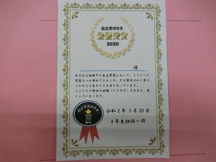 今回の自主学習でがんばった人には上のような賞状シールをプレゼントしました。
