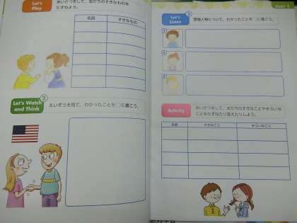 さて,3・4年生は外国語活動で「Let's try!」の教材を使います。