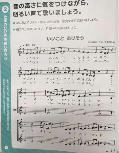 音楽の教科書P10〜11を開いてください。「いいことありそう」です。