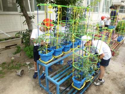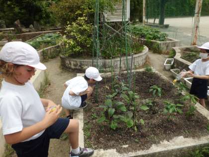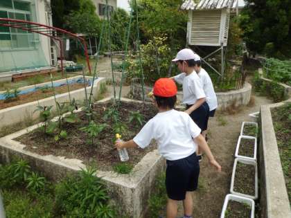今日も,ミニトマト・なす・オクラ・ピーマン・きゅうりに水をやりました。子どもたちは,「あっ,なすの実がいっぱいある!!」,「ミニトマトの黄色い花がさいてる!!」と,うれしそうにやさいのせいちょうをかんじていました。水やりをたくさんしてくれてありがとう!(^^)!