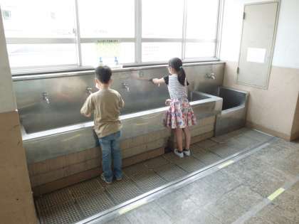 2年生の子どもたちは,すこしずつとう校ごのしゅうかんになれてきたようです。まず,ろうかでさの先生に「けんこうかんさつひょう」をだします。つぎに,きょうしつに入って,にもつをおいて,せんめんじょで手あらいをします。2年生のみなさん,とっても上手に手あらいができていますね!(^^)!