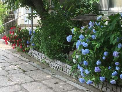けれども,今年は爽快なブルーの紫陽花の横を通って,子どもたちが元気に登校しています。