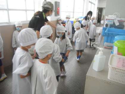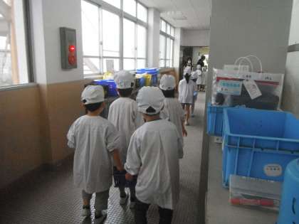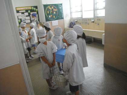 給食当番は,エプロンを着て,帽子をかぶり,マスクをつけて給食室へ給食をとりに行きます。給食室では,「いただきます。」と言って,手を洗い,消毒をしてそれぞれの役割のものを受け取ります。食器やおかずをがんばって,教室まで運んでいます。