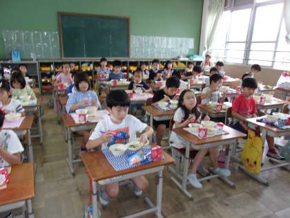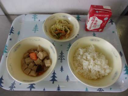 主菜には,子どもたちの苦手な干しいたけが入っています。高野豆腐もあまり食べ慣れていない子たちが多いので,どうかなぁ?という心配をよそに,しっかりと食べられていたので,とても感心しました。