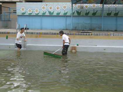 午前中には,学校長と教頭が前もって壁面などを掃除するのが,ここ数年恒例になって,二人の先生は,朝からプールで大奮闘でした。