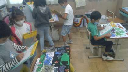 みんな思いを広げて,ダイナミックに表現することができました。描いている時から「○○君のこの色すごい!きれいだね。」「かえるの形がおもしろいわ〜。」と友だちの作品をみてつぶやき鑑賞している様子でした。