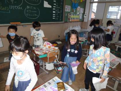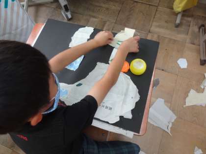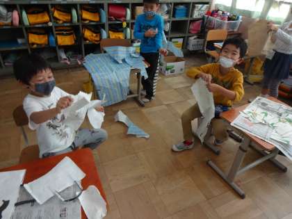 家から持ってきた,包装紙や紙袋などを思いきりやぶいたり,ゆっくりやぶいたりして紙の感触や音を楽しみました。子どもたちは,思いっきり破いて楽しんだ後,その中からおもしろい形の紙を見つけて「くつに見える」「魔女の帽子みたい」「エイに見える。」と宝探しのようにやぶいた紙を見て「大発見したよ。」というように見せあっていました。